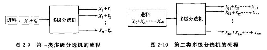 多級分選機可分為兩類。第一類多級分選機,其給料中只育X和Y兩種物料,分選機有兩個以上的排料口,每一排出口中都有物料X和Y,但含量不同,其流程如圖2-9所示。