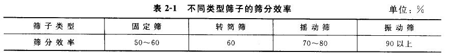 篩子運(yùn)動方式對篩分效率有較大的影響,不同類型的篩分設(shè)備,其篩子運(yùn)動方式不同,其篩分效率亦不同。同一種固體廢物采用不同類型的篩子進(jìn)行篩分時(shí),其篩分效率大致如表2-1所示。