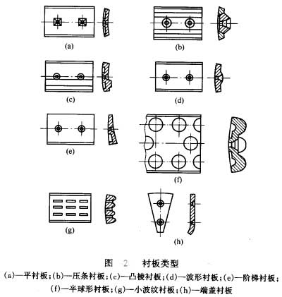 常用襯板的形狀見圖2,形狀較平滑的襯板使鋼球同襯板之間的相對滑動(dòng)較大,產(chǎn)生鉸多的研磨作用,在相同轉(zhuǎn)速下鋼球被提升的高度和拋射所耗的功較少,適于細(xì)磨。凸起部較高的襯板對鋼球的推舉作用強(qiáng),使鋼球能升至較高的位置,沖擊作用較強(qiáng)。橡膠襯板耐磨損(壽命比猛鋼材板高2—3倍)重量輕(比錳鋼襯板輕約85%)、拆裝方便、噪聲小。