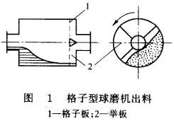 另一種球磨機(jī)是在出料端附近有格子板。格子板由若干塊扇形板組成,扇形板上有寬度為8—20mm的篩孔,物料可通過篩孔而聚集在格子板與右端蓋之間的空間內(nèi)。此空間內(nèi)有若干塊輻射狀的舉板。筒體轉(zhuǎn)動(dòng)時(shí).舉板將物料向上提舉,物料下落時(shí)經(jīng)過錐形塊而向出料端折轉(zhuǎn),經(jīng)右端中空軸排出。由于格子板和舉板的作用,物料在出料端的料位較低,使排料加快,生產(chǎn)量提高,參見圖1。
