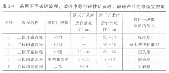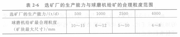 最終碎礦粒度的大小和選礦廠的規(guī)模有很大的關(guān)系,見表2-6 所列。