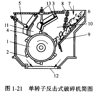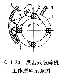 反擊式破碎機的工作部件為帶有板錘2的高速旋轉(zhuǎn)的轉(zhuǎn)子1;給人機內(nèi)的料塊在轉(zhuǎn)子回轉(zhuǎn)范圍(錘擊區(qū))內(nèi)受到板錘沖擊。物料是經(jīng)導(dǎo)板4給人錘擊區(qū)的,料塊被板錘沖擊后拋起;高速地撞在反擊板3上,再次受到?jīng)_擊,然后又從反擊板彈回板錘,繼續(xù)重復(fù)上述過程。在往返過程中,物料還互相碰撞,在沖擊、反彈、相互碰撞等作用下,物料料塊不斷產(chǎn)生裂縫、松散最后破碎,破碎的物料從機體下部卸出。參見圖1—20。