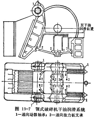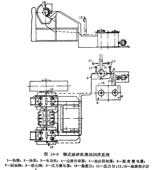 大型破碎機(jī)的干油潤(rùn)滑也必須在一定壓力下進(jìn)行,干油潤(rùn)滑系統(tǒng)見(jiàn)圖19—7。干油從干油潤(rùn)滑裝置獲得壓力后,通過(guò)油管分別進(jìn)入動(dòng)顎軸承和推力扳支承的潤(rùn)滑點(diǎn)進(jìn)行潤(rùn)滑。每班注油4—6次,每次3分鐘左右。