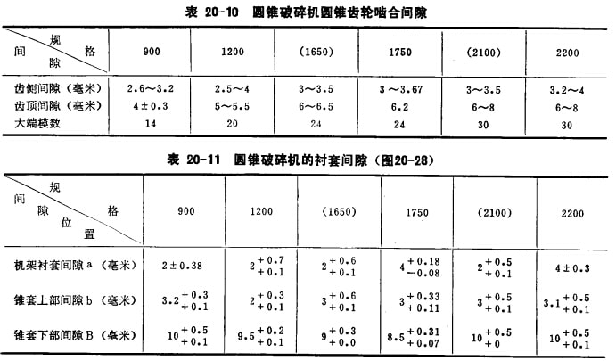 安裝旋回式破碎機和圓錐破碎機偏心軸套部時,應特別洽態(tài)調(diào)整好齒輪的嚙合性能。圓錐齒輪的接觸面積應占齒寬和齒長的50%左右,安裝后齒頂間隙(在齒外端測量)一般應為(0.2—0.3)m,m為模數(shù)。表20—10是圓錐破碎機的合理齒輪嚙合間隙。